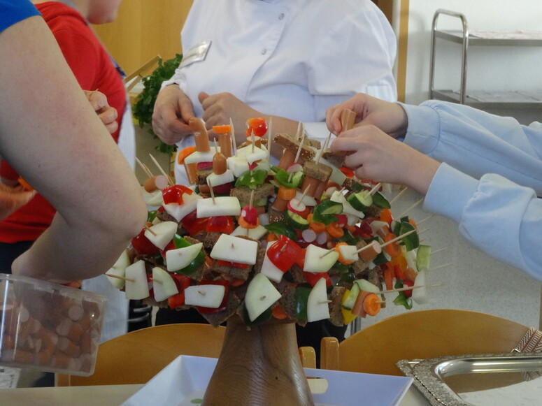 Unter der fachkundigen Anleitung von Frau Gölder, Expertin für Kinderernährung und Kräuterpädagogin, sowie der tatkräftigen Unterstützung engagierter Eltern, wurde jeden Tag ein gesundes Frühstück zubereitet, welches man sich gemeinsam hat schmecken lassen. Mit Tatendrang und Begeisterung waren die Kinder, in diesem Jahr in gemischten Gruppen aller Klassenstufen, dabei. Das Angebot war abwechslungsreich und kreativ: Von kunterbunten Obst- und Gemüseplatten, Rosinenbrötchen, Seelen und selbstgemachten Aufstrichen bis hin zu warmen Speisen wie Grünkernküchlein war für jeden Geschmack etwas dabei. Die Vielfalt der täglich wechselnden Gerichte kam bei den Kindern gut an.