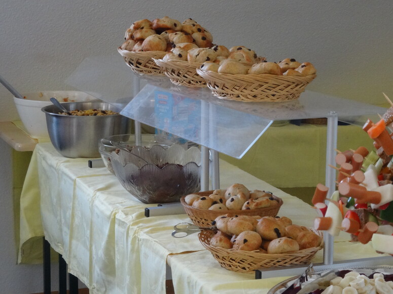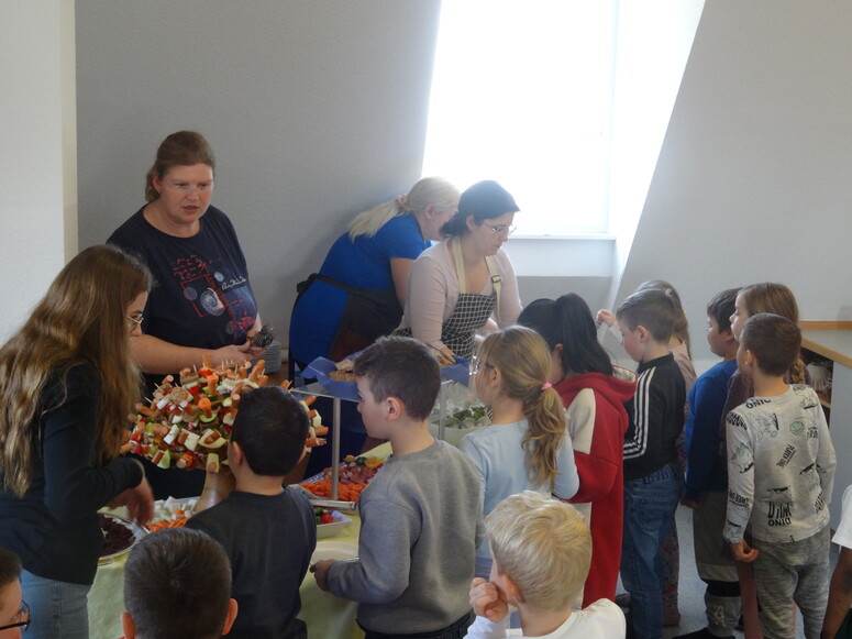 Unter der fachkundigen Anleitung von Frau Gölder, Expertin für Kinderernährung und Kräuterpädagogin, sowie der tatkräftigen Unterstützung engagierter Eltern, wurde jeden Tag ein gesundes Frühstück zubereitet, welches man sich gemeinsam hat schmecken lassen. Mit Tatendrang und Begeisterung waren die Kinder, in diesem Jahr in gemischten Gruppen aller Klassenstufen, dabei. Das Angebot war abwechslungsreich und kreativ: Von kunterbunten Obst- und Gemüseplatten, Rosinenbrötchen, Seelen und selbstgemachten Aufstrichen bis hin zu warmen Speisen wie Grünkernküchlein war für jeden Geschmack etwas dabei. Die Vielfalt der täglich wechselnden Gerichte kam bei den Kindern gut an.